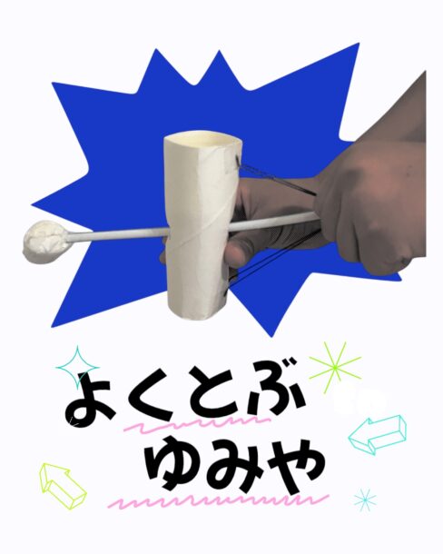 ハサミを使って、誰でも簡単に作れる弓矢です。使う材料は、トイレットペーパーの芯・ストロー・ティッシュ・輪ゴムだけ! 想像以上に飛びます。ハサミで切る作業が難しい場合はお手伝いしますので、安心してご参加ください。
