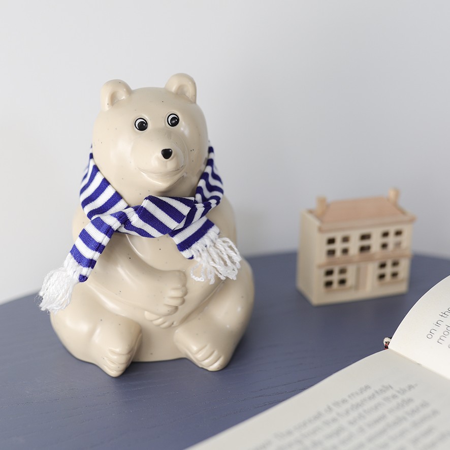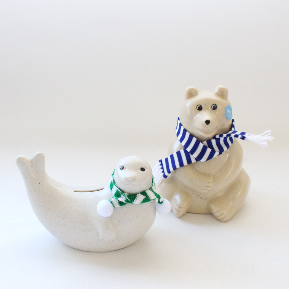 フィンランドのシロクマ&アザラシ貯金箱。2025年限定のマフラーもついてます。