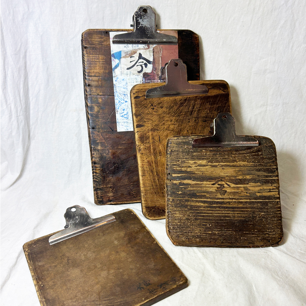 創作クリップボード。江戸から昭和の木箱から切り出し、風合いを生かしたワックス掛けとヤスリ加工。