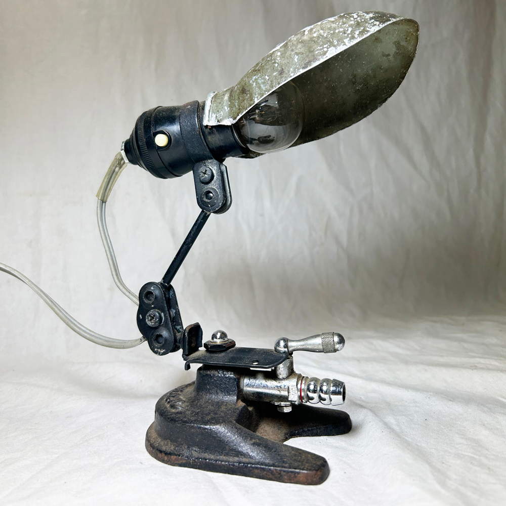 MAREBITO【創作】ランプ。ガスの元栓スタンド台と古いミシンについていた傘をリメイク。