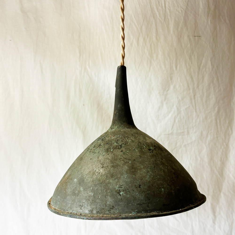 MAREBITO【創作】ランプ。古い漏斗を傘にしたランプ。その他、真鍮仏具を再利用したものや漆を塗る前の木なりのお椀をリメイクしたもの、多数お披露目します。
