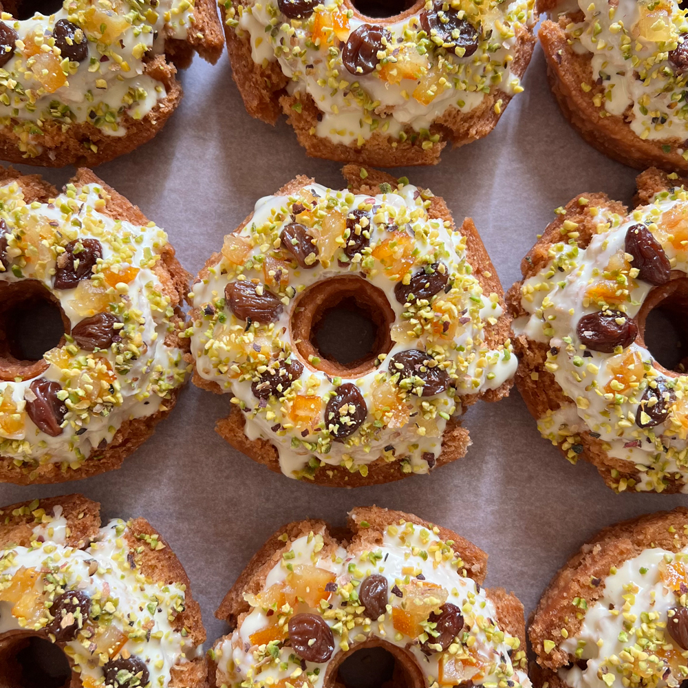 ホワイトチョコをかけて、ラムレーズンとオレンジピール、ピスタチオダイスで見た目も華やかなラムホリデイ