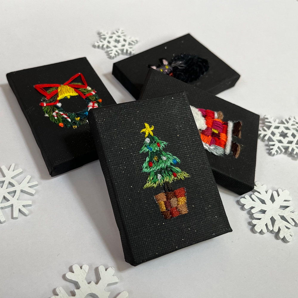 今年も新しいモチーフを増やし、たくさんの方に見て楽しんでもらえるよう頑張ります! 全てが一点もののブローチやアクセサリー、キットやハンカチ。飾りやすいキャンバス作品も様々なサイズをご用意しておりますので、どうぞお楽しみに! 色の違いや表情の違いも手刺繍ならではとなっておりますので、お気に入りの作品を見つけるお手伝いもさせていただきます。ぜひお気軽にお声掛けください!