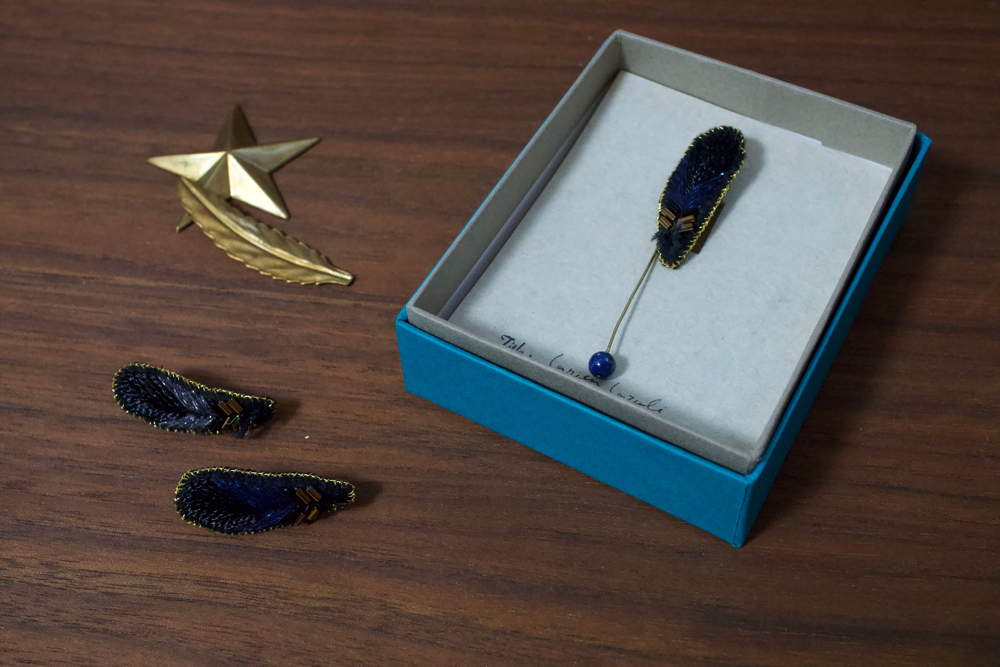 標本のように飾っても、コートや上着に合わせても存在感のある羽根のブローチ