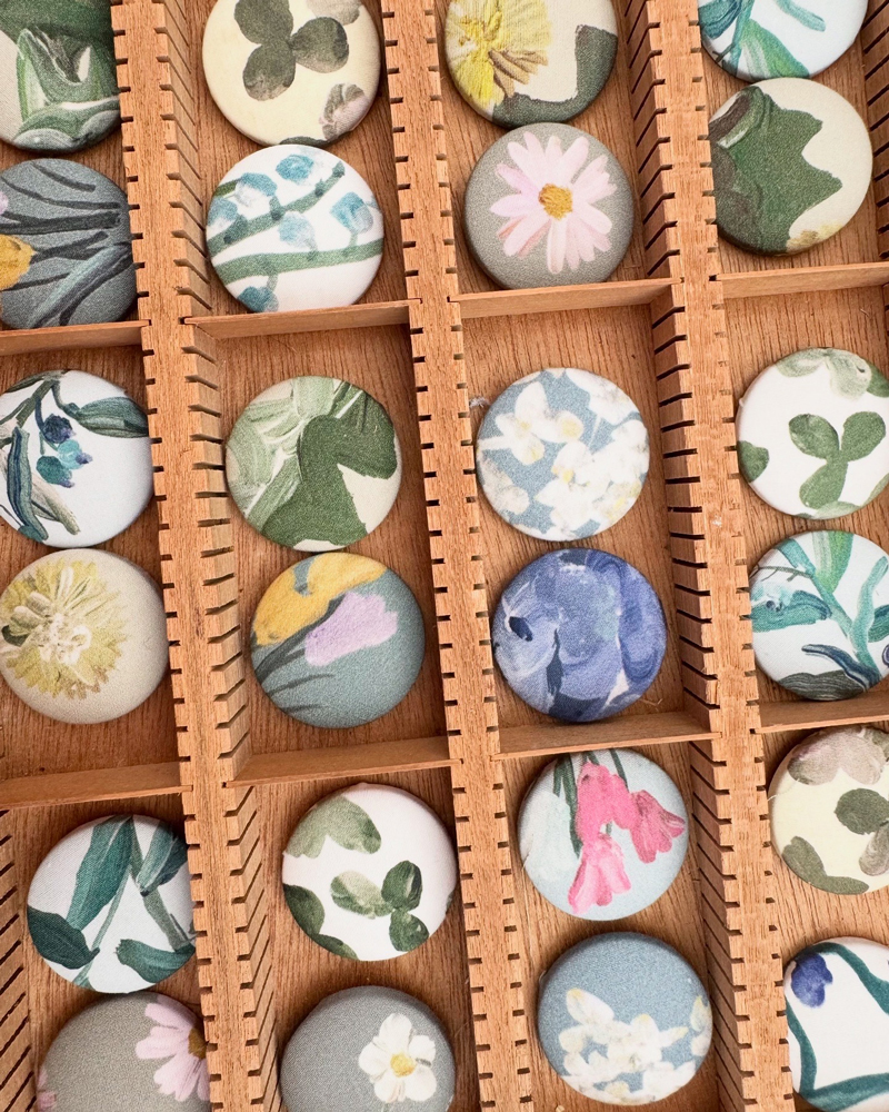 オリジナルテキスタイルのハギレで作るくるみボタン。セルフサービスのワークショップになります。