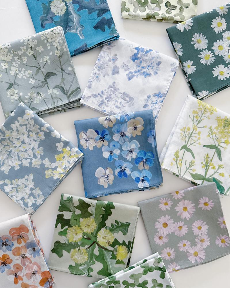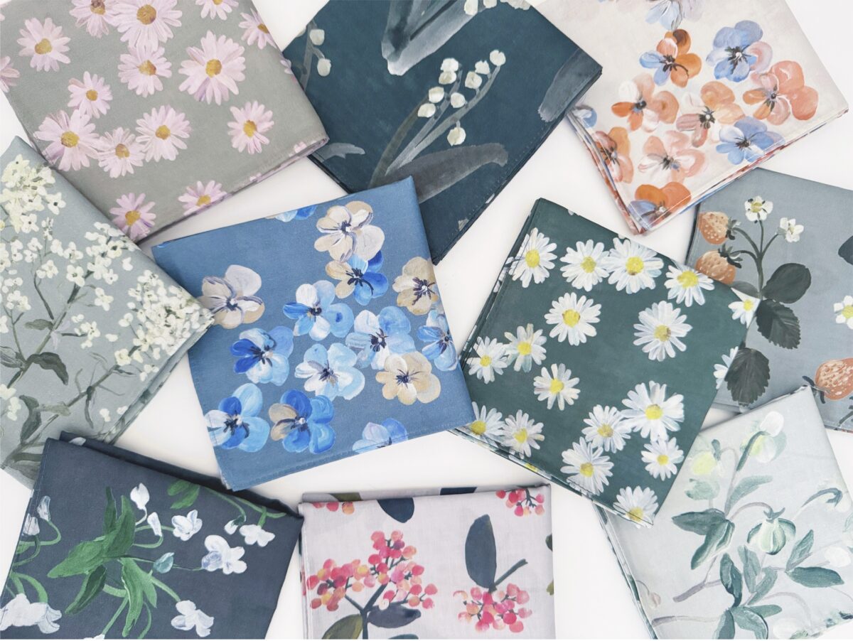 手描きの絵を落とし込んだ植物柄のハンカチたち。大判サイズなので、首元や頭に巻くのもオススメです。