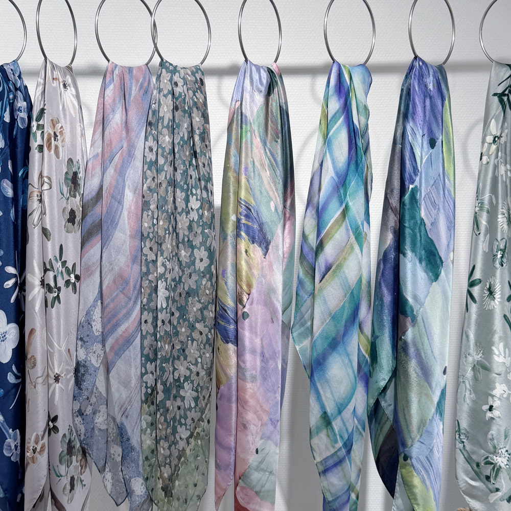 景色をモチーフに描いたシルクスカーフ。一年中使えるアイテムです。
