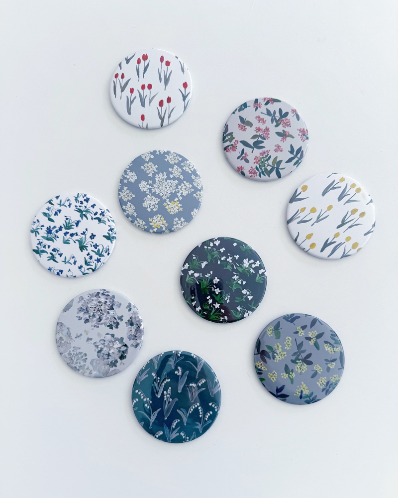 草花や景色など身近な自然をモチーフに絵を描き、手描きのタッチを活かした図案、落ち着いた色遣いにてオリジナルテキスタイルを制作。ハンカチやポーチ、ミラーなどそっと生活を彩るアイテムを展開しています。