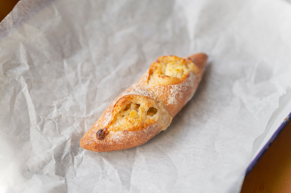 「季節の果実とよつ葉のクリームチーズのカンパーニュ」りんごの爽やかな酸味がクリームチーズとよく合います。