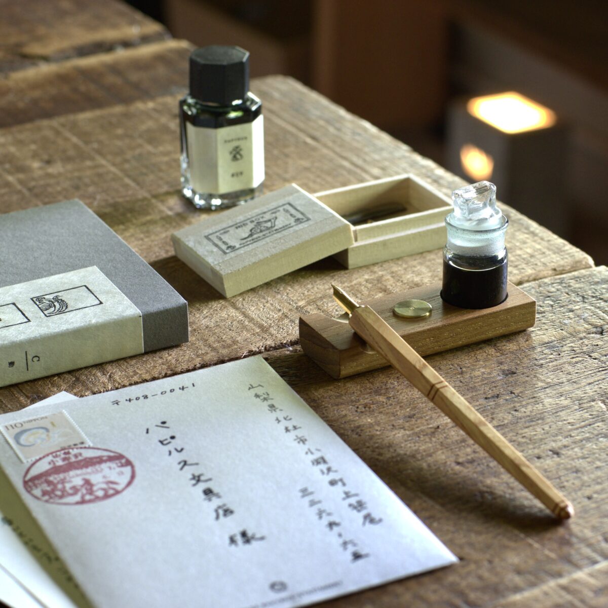 手彫りの版で一枚一枚刷り上げる紙製品や、真鍮を削り出したオリジナルのつけペン軸、木工作家ゴロンドリーナさんと共同制作している木製のつけペン軸など、書くことが楽しくなるようなデスクトップアイテムを自分たちの手で作り、販売しています。