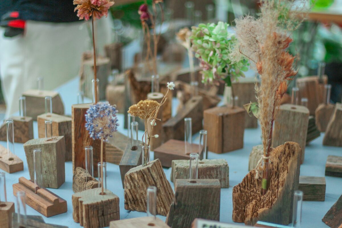 また、私たちは、レスキューしてきたものをそのままの形で次に繋げるのはもちろん、形を変えて繋げていく活動もしています。リビセンオリジナルプロダクトもそのうちのひとつ。レスキューした古材とガラスを使ったフレームや、制作の過程で切り落とした木端から生まれた一輪挿し、看板にもディスプレイにも使える木製プレートなど、蚤の市には、1年のイベントの中でも最大量のプロダクトを持っていきます!