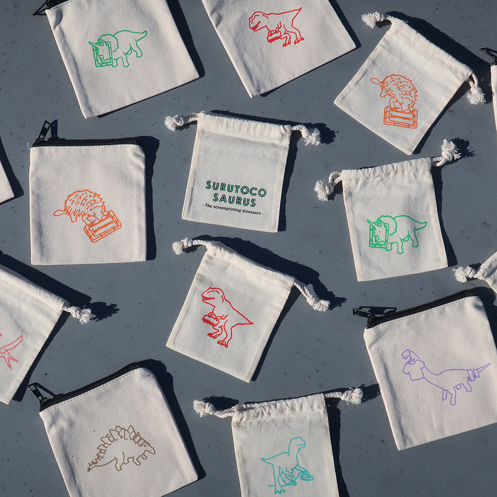 「SURUTOCOSAURUSガチャ」ミニ巾着かミニポーチ、どちらが出るかは回してみてのお楽しみ。