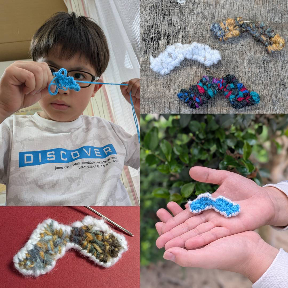 副駅長新作のひげブローチ。心を込めて編みました。洋服やカバンにぜひどうぞ!