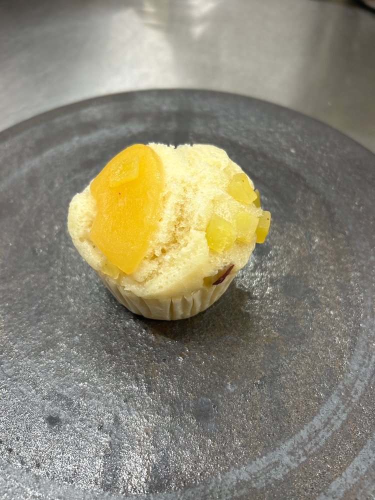 りんごとさつまいも蒸しパン。りんごとさつまいもの甘煮が入った、お子さまから年配の方まで人気の蒸しパン。