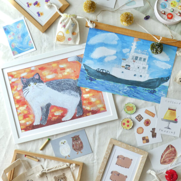 お絵かき好きな小学生姉妹のお店です。描いた絵をポストカードや雑貨にして売っています!