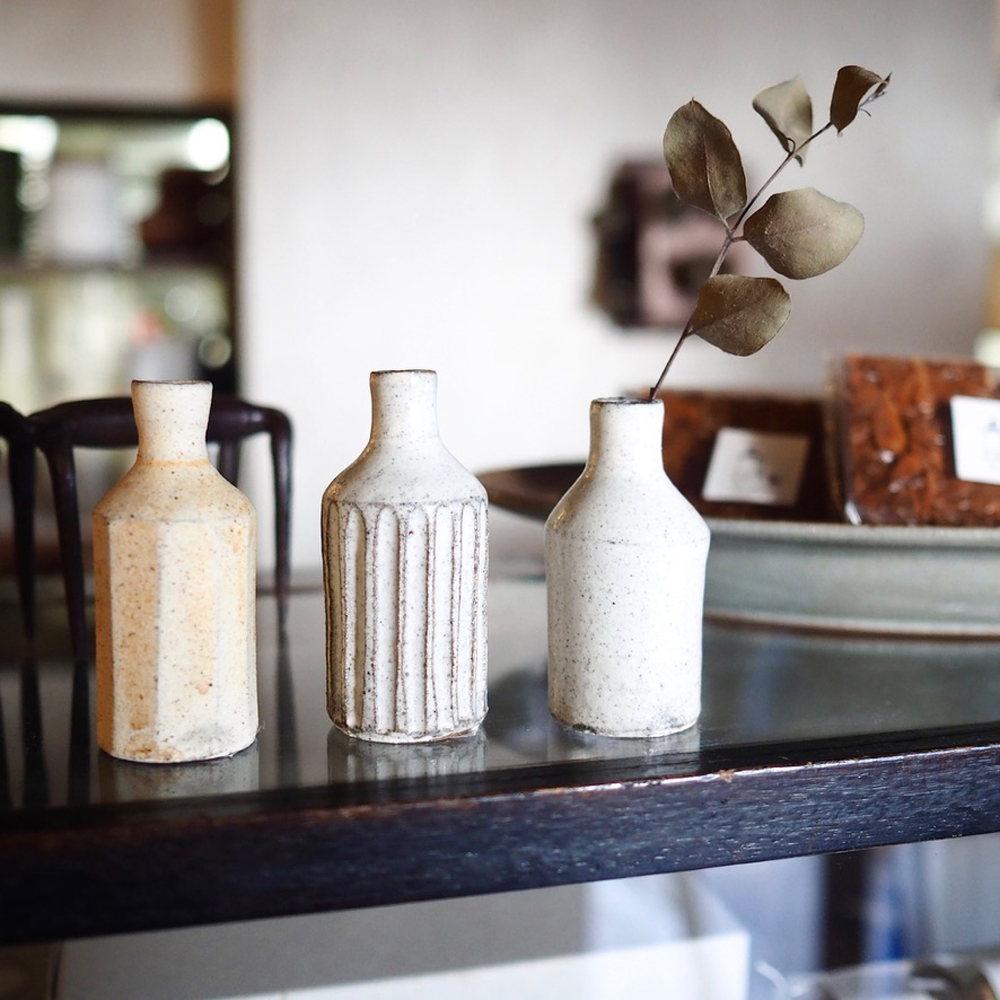 お部屋に飾りたくなる益子焼の一輪挿し。それぞれの風合いをお楽しみください。