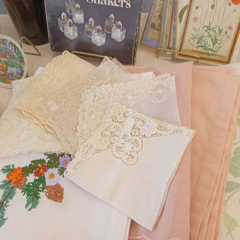 ヴィンテージの刺繍が施された布やレース、ハンカチもたくさん持っていきます