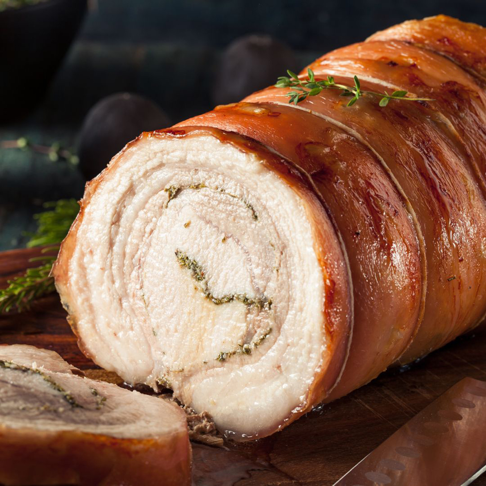 スペイン産の豚バラ肉にスパイスとハーブで味付けし、じっくりと焼き上げたローストポークです。