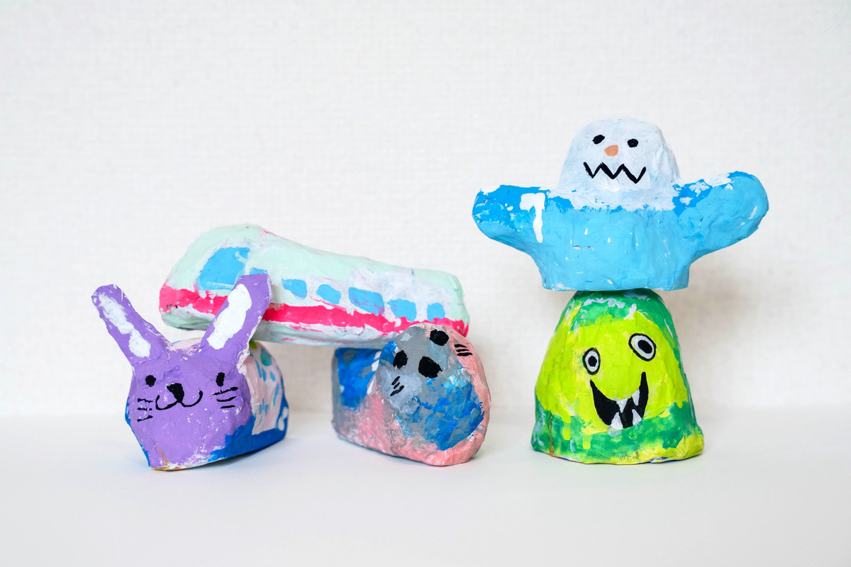 ダンボールから生まれた動物クラフトやスーパーマーケットをテーマにしたオリジナル塗り絵ブック、1点もののキーホルダー、キャンバスに描いた色とりどりの絵画など、遊び心あふれる作品をそろえています。そして今回の見どころは「ゆる張り子」。紙を何層にも重ねて貼り、じっくりと仕上げた本格的な張り子の置き物です。生き物だけでなく、不思議な形やモチーフがゆるいフォルムで現れ、思わず笑みがこぼれるユニークな作品になりました。