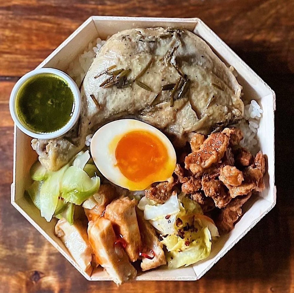 満魯福福弁当。特製のネギ山椒ソースで食べる長時間じっくりとコンフィした骨付き鶏肉と副菜3種、そして魯肉飯と煮卵がついた台湾を感じるSpecialなお弁当です。