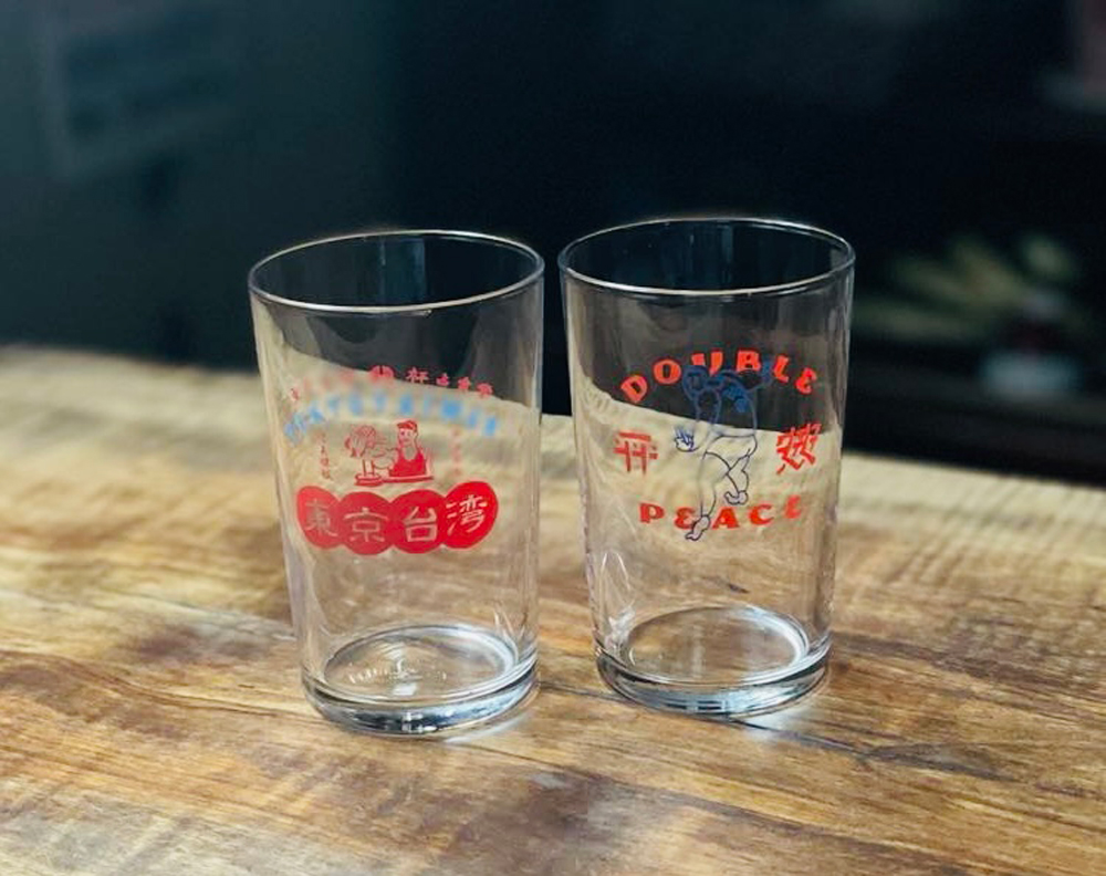 チョークボーイさんデザインのグラス。東京台湾バージョンと平平安安のダブルピースを願ったデザインの2種類。