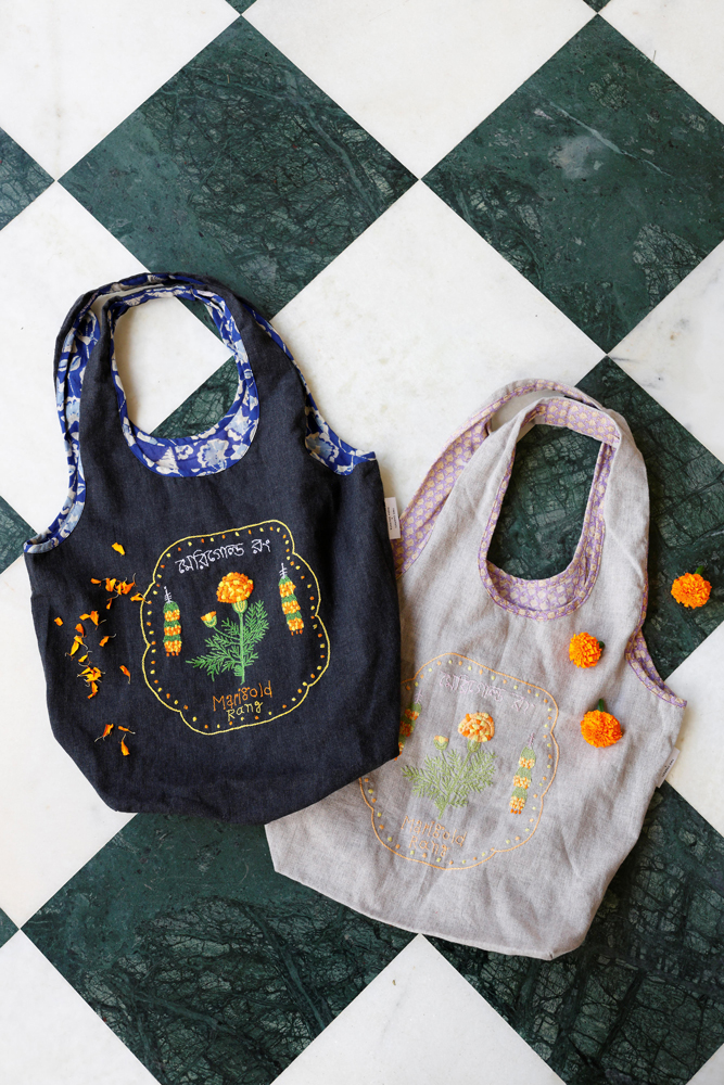 コルカタのフェアトレードNGOと一緒に製作したマルシェバッグ。インドの街にありそうな花屋さんをイメージしたマリーゴールドの刺繍デザインです。
