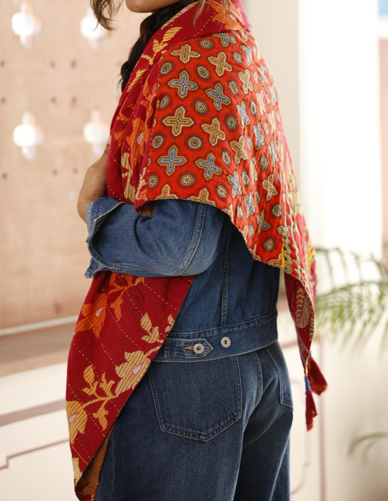 古着のサリーをパッチワークして刺子したショール。アウターの上からも身体をすっぽり包める140cmの大判サイズです。
