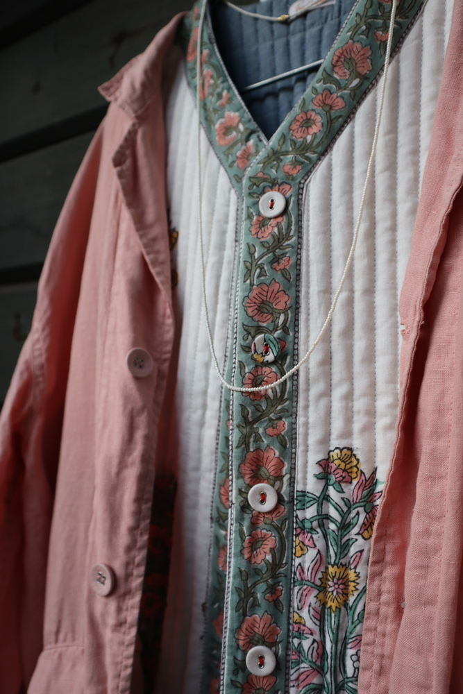 ブロックプリントのキルトベスト。すっきりとしたシルエットで肌寒い季節にインナーベストとしておすすめです。