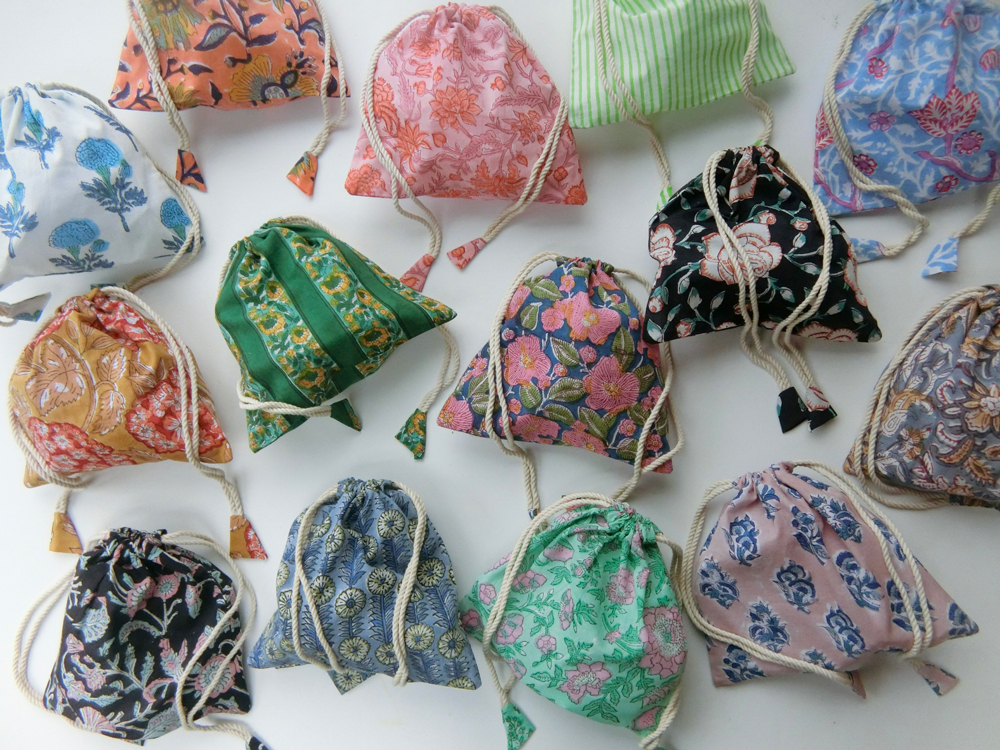 ジャイプールでセレクトしたブロックプリント生地で作った巾着。ハンカチを入れて、ギフトにもぴったりなサイズです。