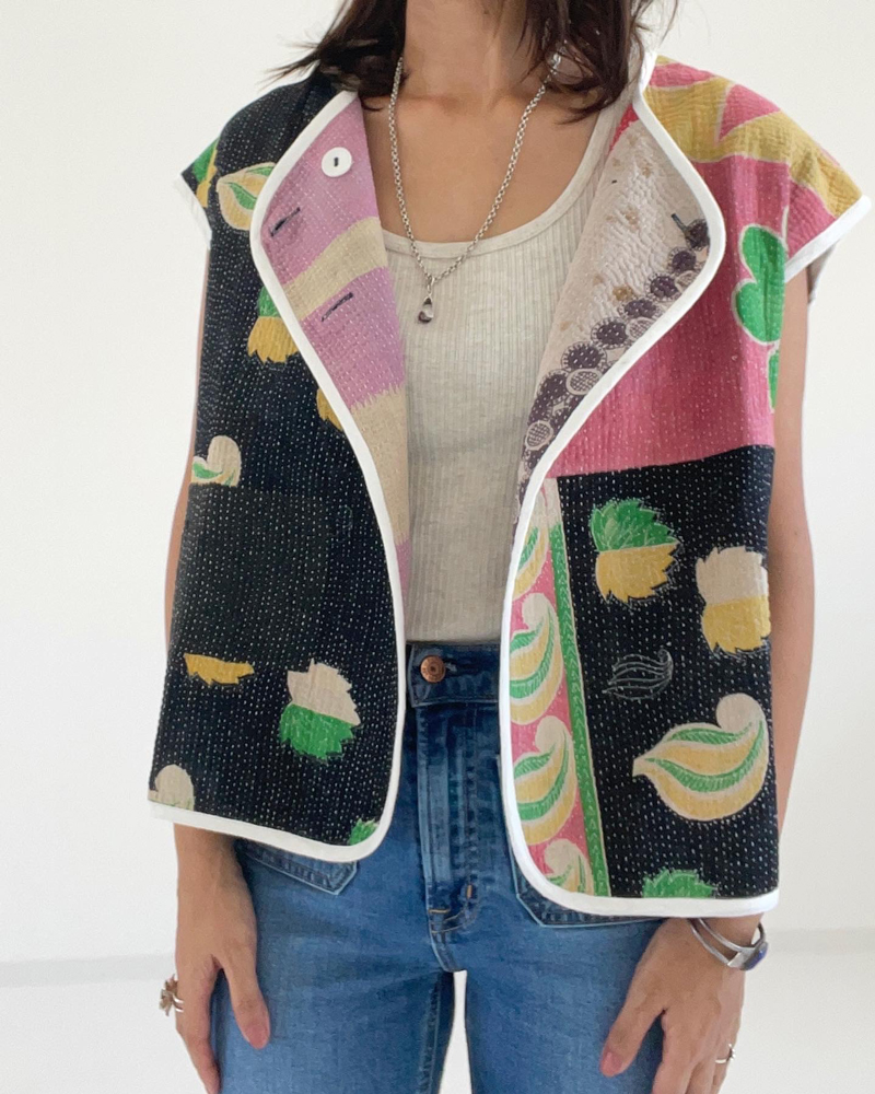 ビンテージカンタのベスト。古い生地をリメイクしているためすべて1点ものです。お気に入りをぜひ見つけてくださいね。