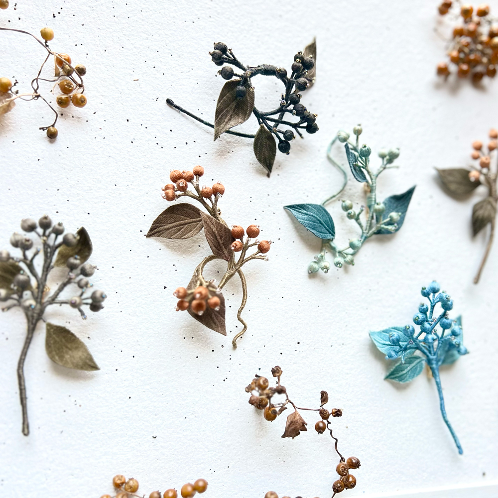 布や糸を島の木や植物、畑で育てた藍から取り出した色で染め、布花・刺繍などさまざまな手法を用い、ひとつひとつ丁寧な手仕事で作るアクセサリーたちは時と共にゆっくりと色褪せてゆく……。そんな変化も感じて身に着けていただけたら。