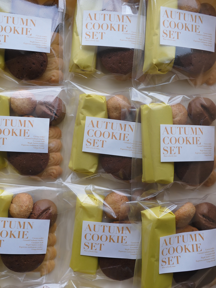 「AUTUMN COOKIE SET」ジンジャーブレッドや珈琲カルダモンのショートブレッドなどのスパイスクッキーが2種、ココアやキャラメルウォールナッツ、メープルなどのベーシックが4種、秋に珈琲と食べたいクッキーが6種入ったセットです。