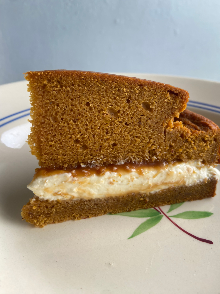 キャロットケーキ。有機栽培の人参をたっぷり、スパイスは柔らかめ、人参の甘さを生かしたキャロットケーキです。クリームチーズと蜂蜜のすっきりとしたフラスティングを挟みました。