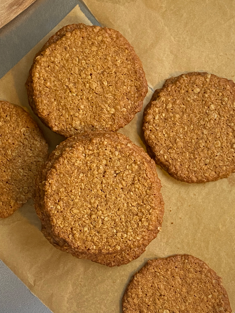「グルテンフリーアンザッククッキー」キャラメルのような香りが後を引くオートミールクッキーです。オーストラリアの伝統的なお菓子を、より体に染み渡る材料でお作りしています。リピーターの方が多いおやつです。