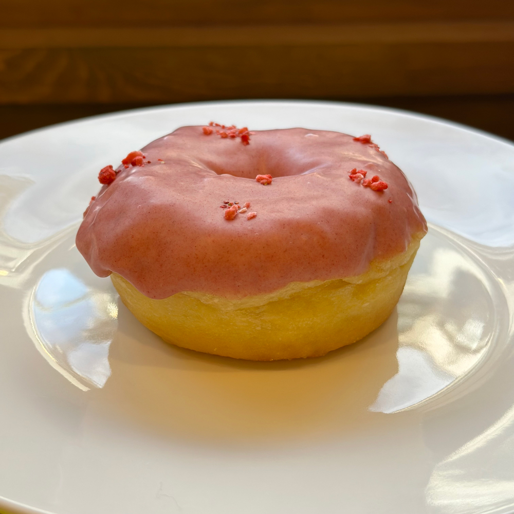 「ベリーベリードーナツ」ドライストロベリーで作った自然の色と味わいのチョコレートドーナツ。お子様人気NO.1です。