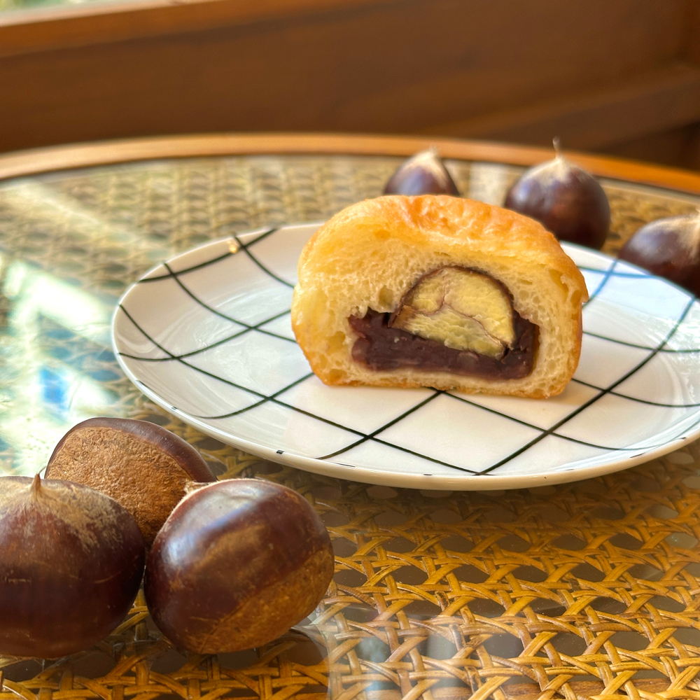 「栗とあんこ」秋の手仕事。手作りしている和栗の渋皮煮を、甘さ控えめの粒あんと一緒にドーナツ生地で包みました。