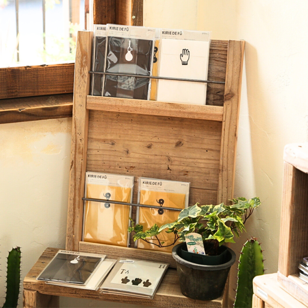 足場板古材のレターラック。東京蚤の市で買ったお洒落なポストカードを飾ってみては?