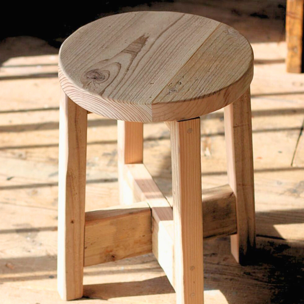 足場板古材を使用して製作した懐かしい雰囲気の丸椅子
