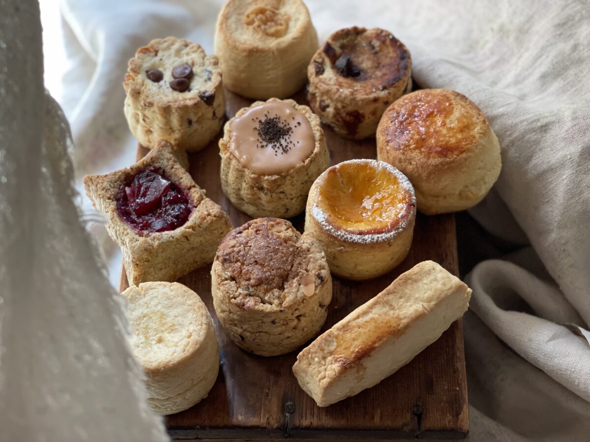 スコーンや英国菓子を中心とした焼き菓子やケーキ、オリジナルのスコーン、バンダナや木彫りのスコーンブローチ、店主が英国各地で集めたコットンバックや雑貨などもお持ちします。