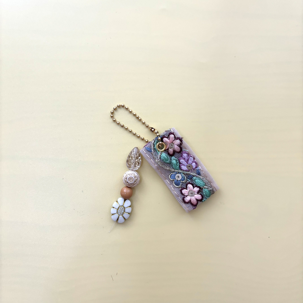 「インド刺繍ストラップ」インド刺繍リボンを使ってつくったストラップです。繊細で上品なインド刺繍は、おとなの方にもお勧めです!