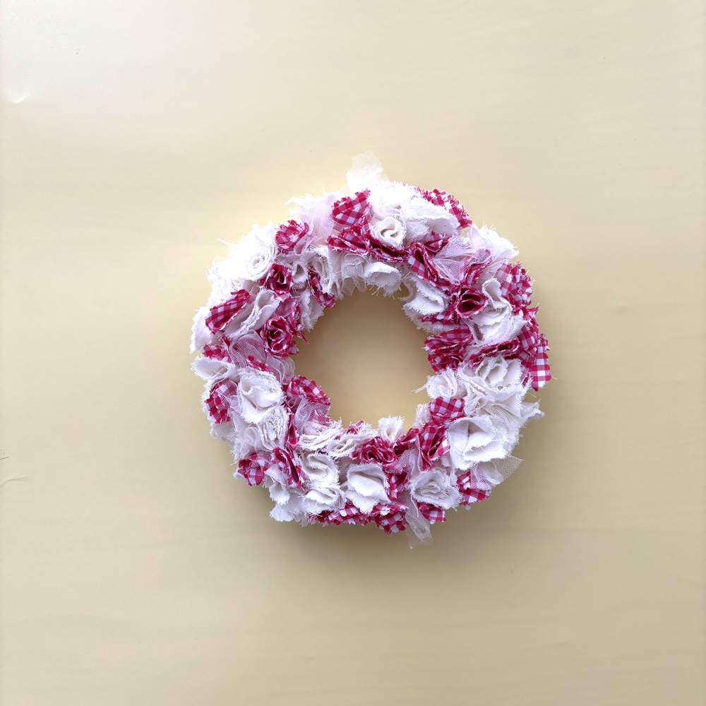 「布リース」布のハギレを使ってつくったリースです。飾るだけで簡単にお部屋のインテリアにもなるアイテム。