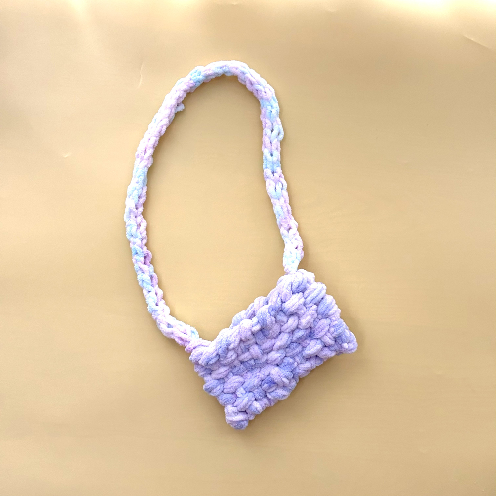 「毛糸ショルダーバッグ」指編みで作った、モコモコの毛糸バッグです。パステルカラーがかわいい、冬におススメのバッグです。