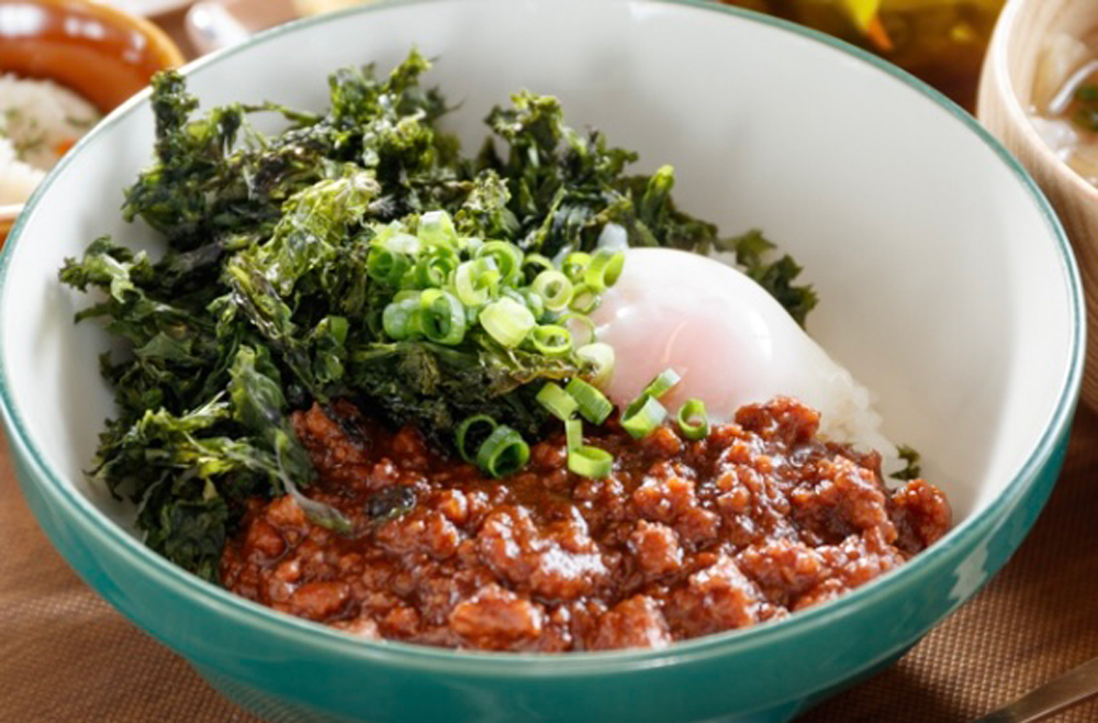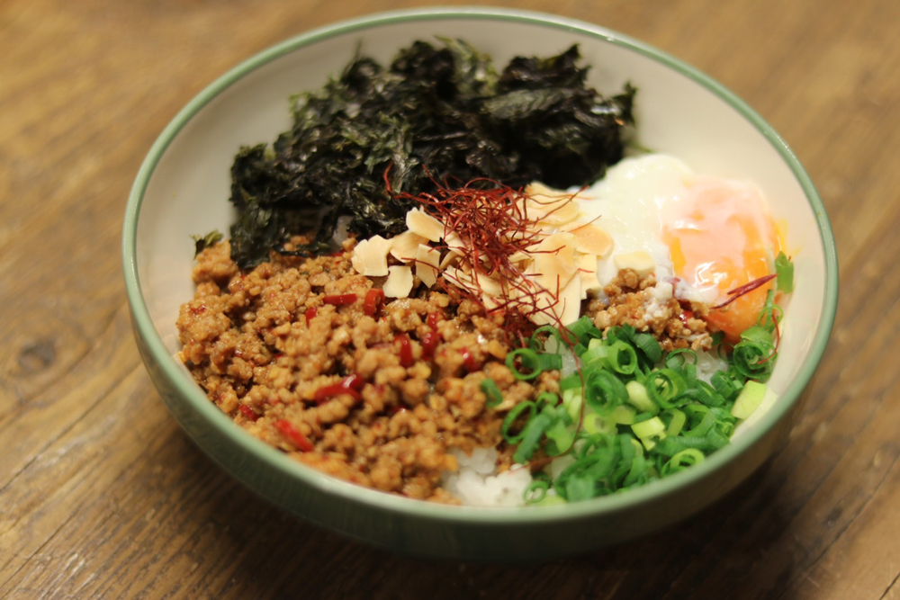 旨辛の台湾肉みそに温玉、海苔、ネギ、アーモンドを乗せた台湾肉みそごはん。辛さが病みつきになる一杯!