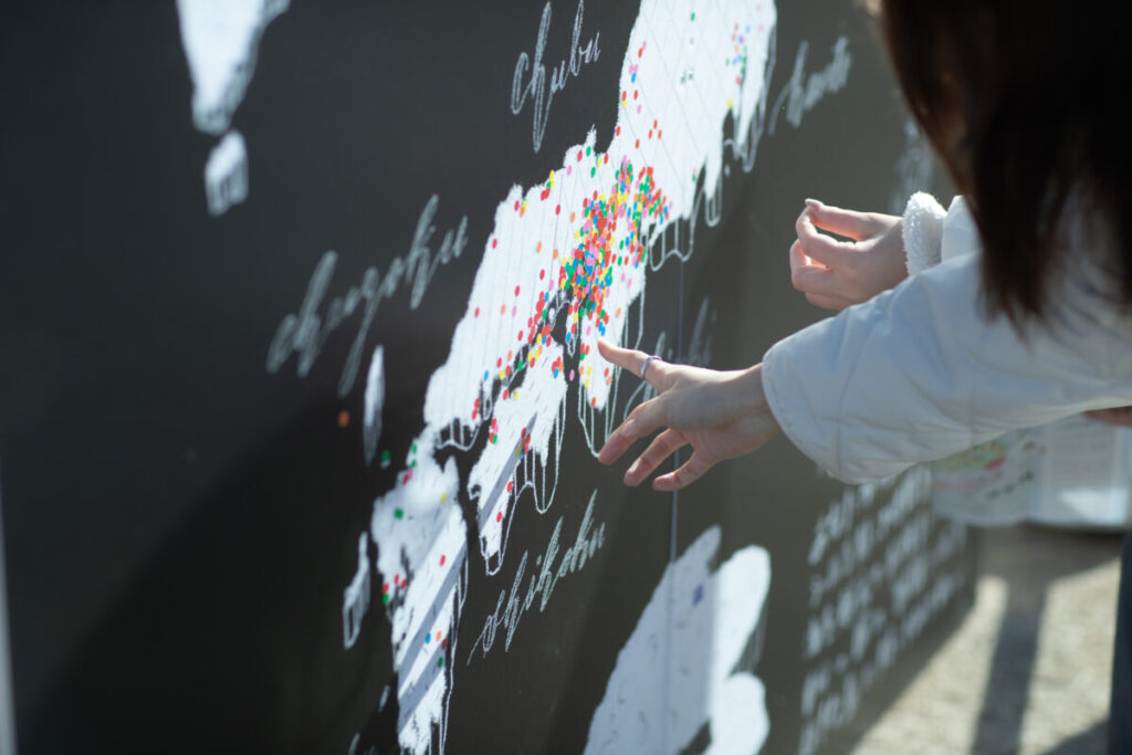 こどもも楽しめるアトラクション「どこから来ましたかボード」「クリスマスツリーをシールで飾ろう!」