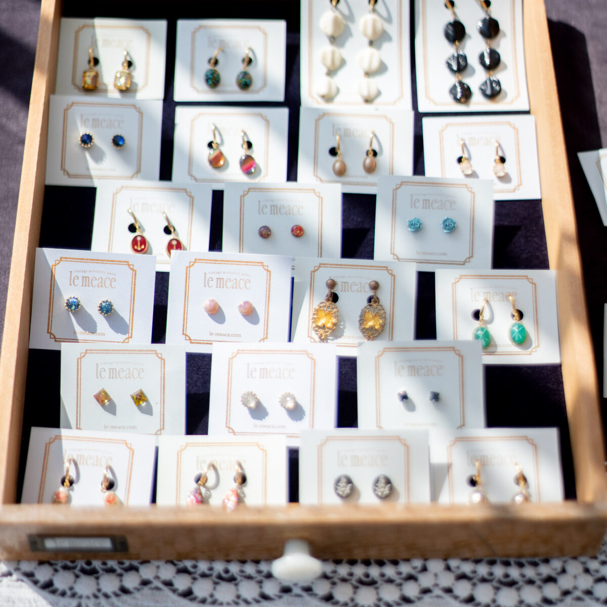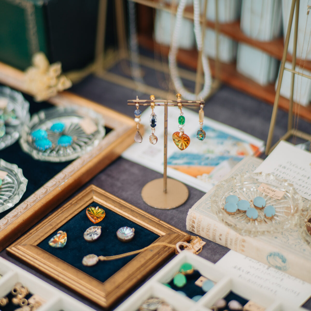 ガラスの裏面から精巧に彫られたインタリオペンダント、星のように輝くプリズムスターパーツ、一度見たら忘れられない貴重なサフィレットなどなど、関西蚤の市ではなんと1500種類以上のパーツが並びます! 売り切れたらもう二度と手に入らない、一期一会のヴィンテージ。ぜひお早めにご覧くださいませ。ブースはすみれ色のテーブルが目印。万博記念公園でお待ちしてます。