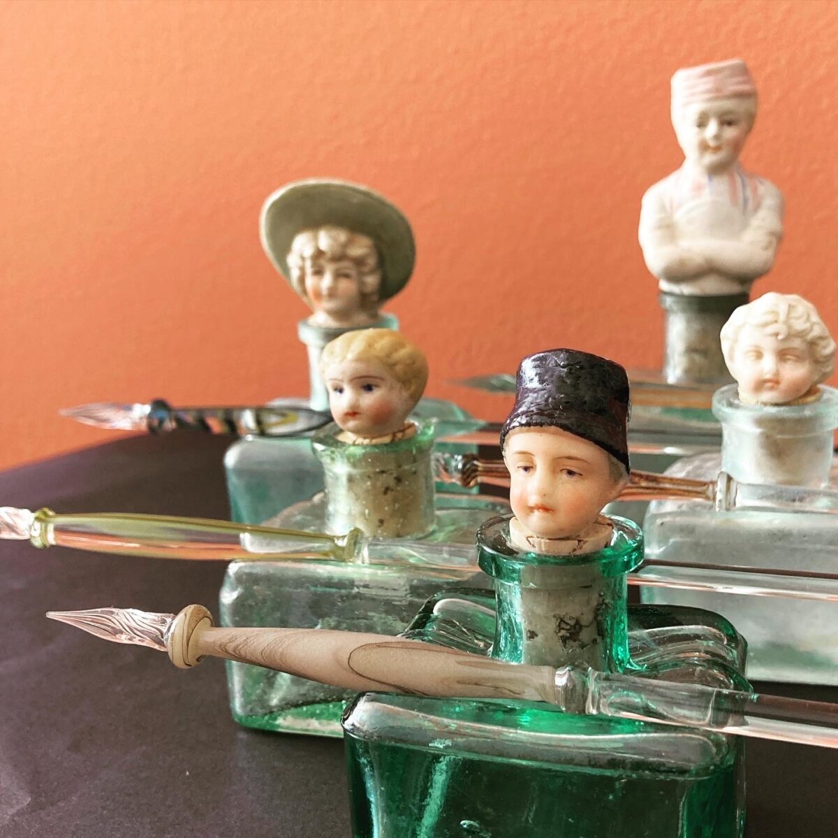 「ガラスのインク瓶とペンのセット」ビスクドールのヘッドがイング瓶の栓になっています。