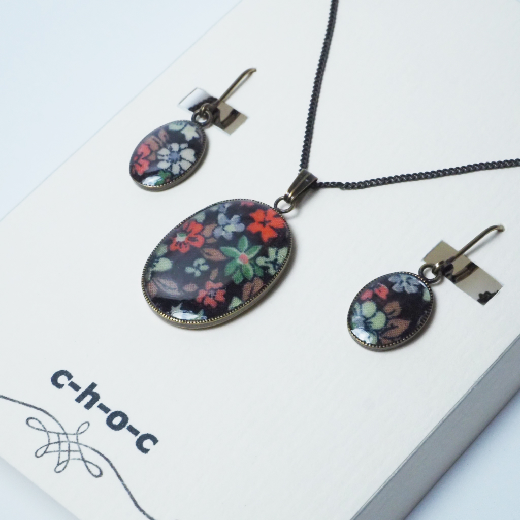 「リバティアクセサリー」ヴィンテージのリバティプリントの生地を使ったオリジナルアクセサリー。ネックレスとイヤリング_ピアスのセットは、大切な方や自分へのギフトにいかがですか。