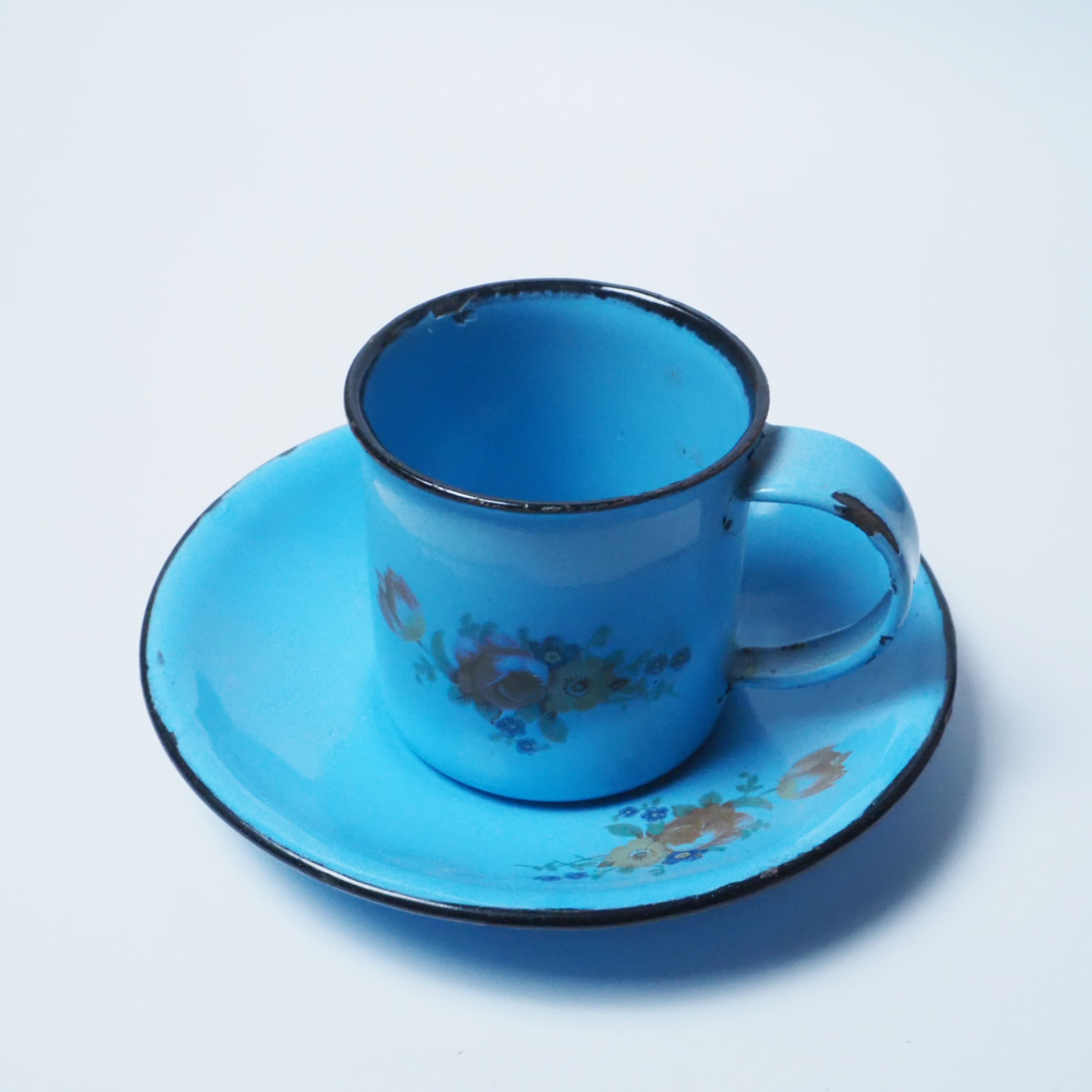 「ミニチュアカップ&ソーサー」琺瑯でできたミニチュアのカップ&ソーサー。綺麗なブルーとレトロな花柄がポイントです。