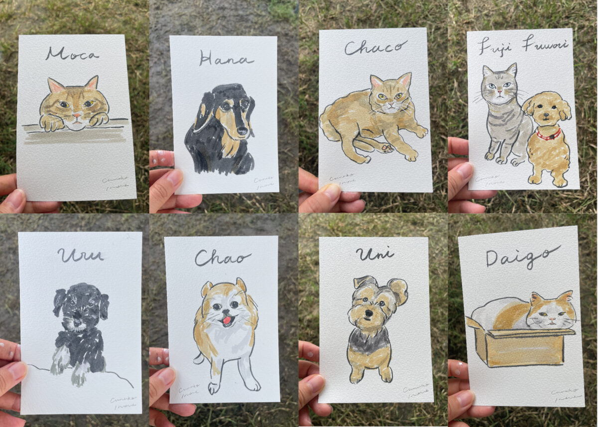 ペットや動物の似顔絵を描きます! 犬や猫などの描いてほしい画像を見ながらポストカードサイズの用紙に描きます。画像を1枚Airdropで送っていただくか、画面の写真を撮らせていただき、見ながら描きます。1枚描くのに20分くらいかかりますので、Canako Inoueのお店にまた取りに来てくださいね。