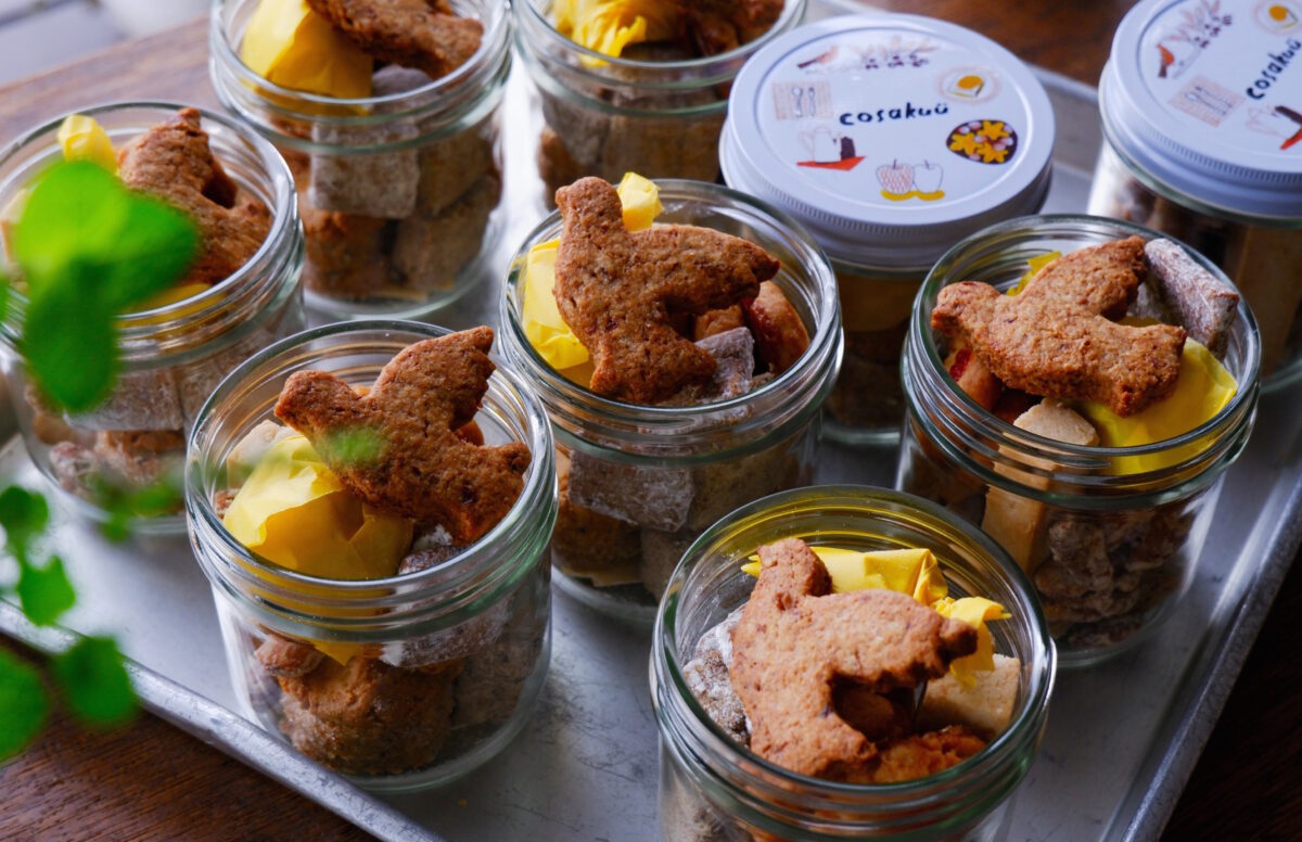 「コサクウのおやつボトル」開けるたびに微笑むイラストの描かれた9種類の焼き菓子がぎゅっと詰まった瓶。
